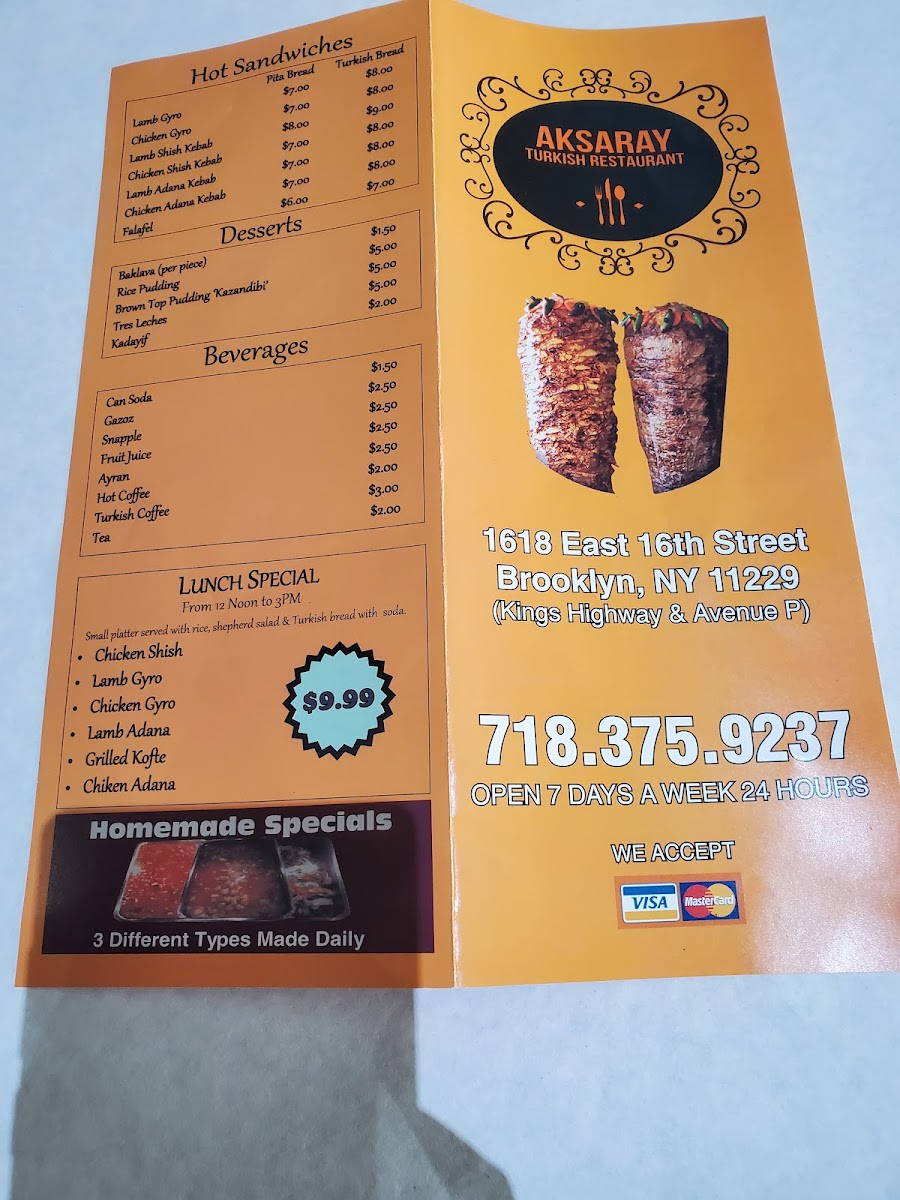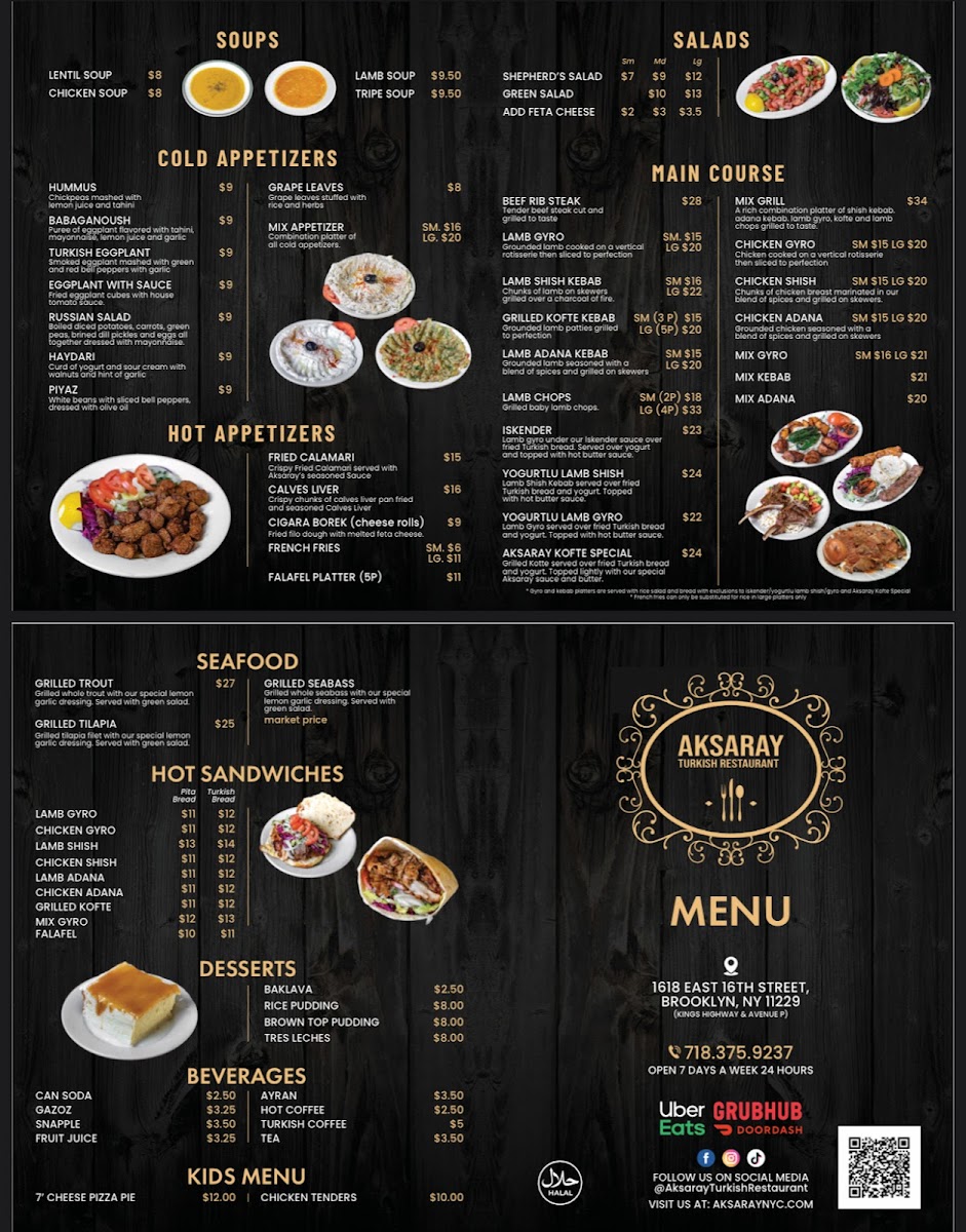 Aksaray, located in the heart of Brooklyn's Midwood neighborhood, is a standout destination for authentic Turkish cuisine. Open 24 hours, it offers a delightful array of dishes, from mouthwatering Aksaray kofte to tender lamb chops and homemade baklava. Diners rave about the friendly, attentive service that enhances the overall experience. The inviting atmosphere is complemented by fresh ingredients and generous portions. Signature items like the grilled kebab platter and traditional soups are not to be missed. Aksaray's commitment to quality and customer satisfaction ensures that each visit is memorable, making it a beloved spot for locals and newcomers alike.